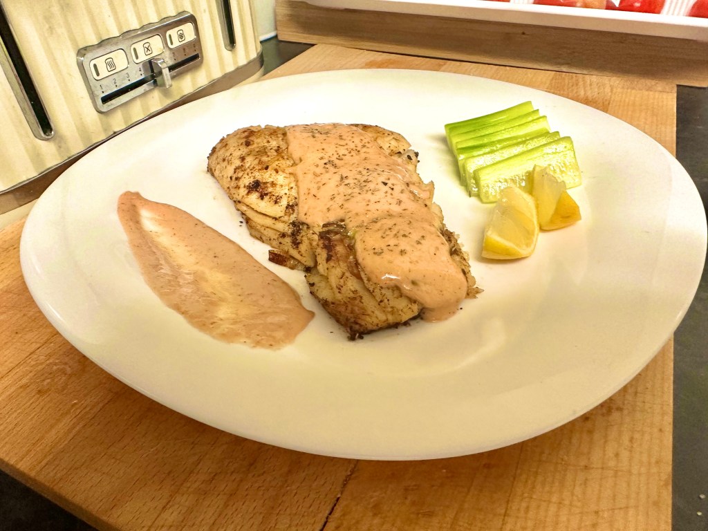 I found a salmon in the freezer and a light bulb clicked, I was hungry, but decided to try make something fancy and presentable, I seared the salmon, cut some cucumber and lemons for colour, and created a amateur sauce with ketchup, mayo and garlic powder and finally topped it off with some pepper.